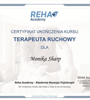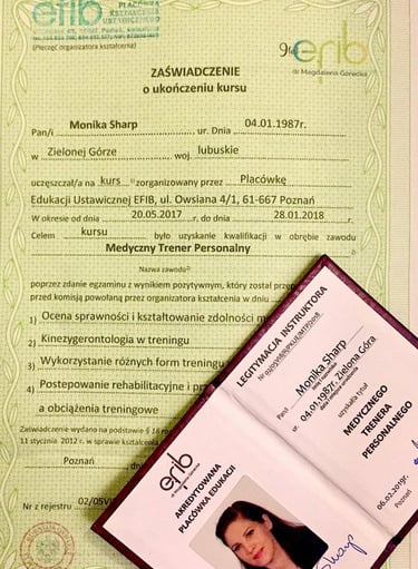 Z pasją do zdrowia i ruchu, rozpoczęłam swoją przygodę jako trener medyczny, ukierunkowując swoje działania na leczenie i usprawnianie poprzez ruch. Ukończyłam dwuletnią edukację, zdobywając prestiżowy tytuł Medycznego Trenera Personalnego, co czyni mnie jedną z pierwszych osób w Polsce posiadających te unikalne uprawnienia. Moje kształcenie obejmowało 9 specjalistycznych modułów, dzięki którym zyskałam potężne narzędzie do prozdrowotnej i terapeutycznej pracy z ciałem.